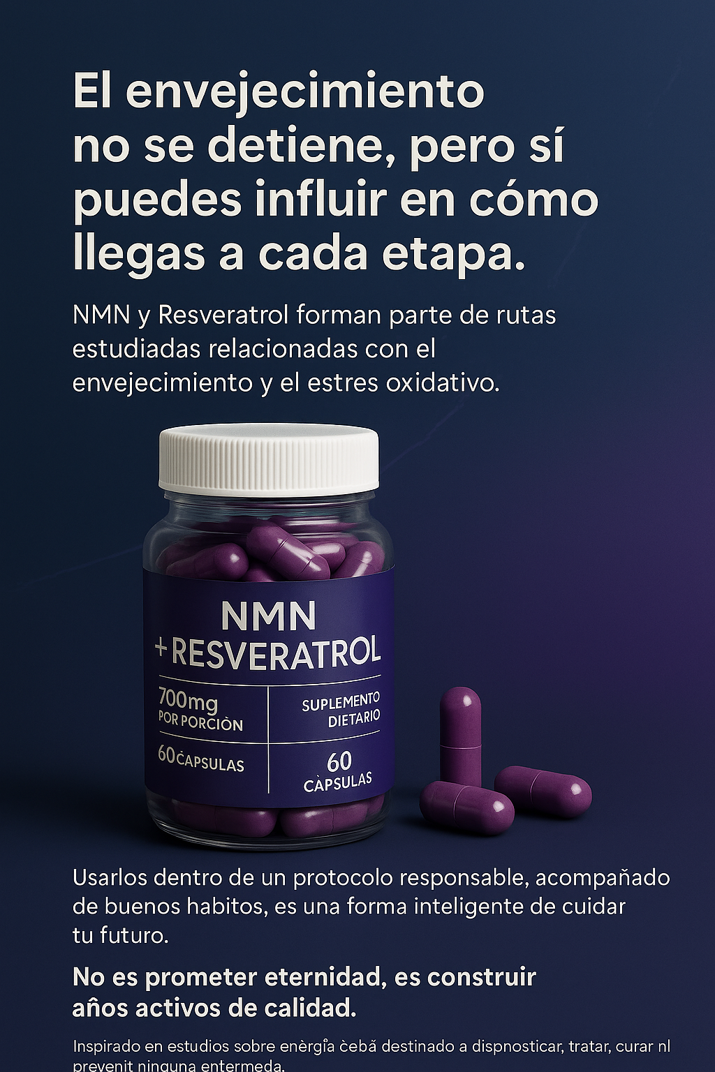 El envejecimiento no se detiene, pero sí puedes influir en cómo llegas a cada etapa. NMN y Resveratrol participan en rutas relacionadas con el envejecimiento y el estrés oxidativo. Usarlos dentro de un protocolo responsable, acompañado de buenos hábitos, es una forma inteligente de cuidar tu futuro. No es prometer eternidad, es construir años activos de calidad.